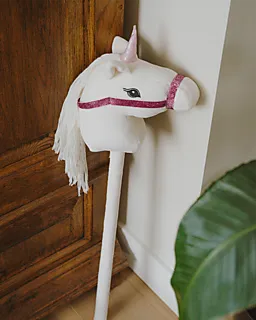 Ce cheval-bâton blanc a un licol rose et scintillant, ce qui lui donne un air joyeux pendant le jeu. Grâce à la longue tige, vous pouvez le faire galoper facilement d’un côté à l’autre. Sa crinière douce bouge avec lui, ce qui rend le jeu vivant.