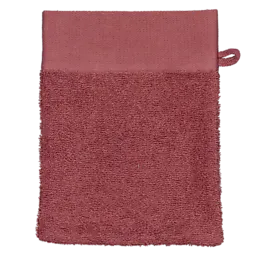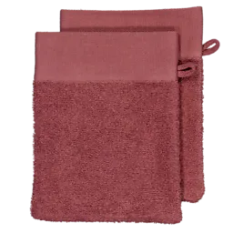 Ce lot comprend deux gants de toilette couleur terracotta, fabriqués dans une douce texture éponge avec un bord supérieur renforcé pour une bonne prise en main. La boucle sur le côté permet de les suspendre facilement pour un séchage rapide. Le tissu est doux sur la peau et permet de se laver confortablement le visage ou le corps.