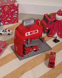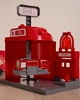 Garage en jouet de couleur rouge uni, avec caserne de pompiers et camion de pompiers. La garage possède une barre de pompier pivotante, un panneau sur le toit et une pièce séparée à côté du bâtiment principal. Les enfants peuvent placer et déplacer des véhicules dans la garage. Ce jouet stimule l’imagination et offre beaucoup de plaisir aux filles et garçons qui aiment jouer avec des véhicules.