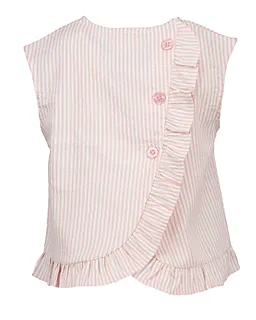 Ce haut rose pour fille est en tissu finement tissé avec des rayures verticales roses et blanches. Il est sans manches et possède un col rond, ce qui permet de l’enfiler facilement. Des volants se trouvent en bas et à l’arrière du haut, ce qui lui donne une coupe légère et simple. Grâce à sa finition souple, ce haut se porte confortablement lors des journées chaudes.