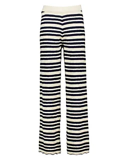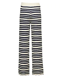 Ce pantalon beige pour fille a une coupe longue et un aspect tricoté. Les rayures horizontales bleu foncé et blanches donnent au pantalon un look ludique. La taille élastique permet de l’enfiler facilement et assure un bon maintien. Le modèle ample offre une grande liberté de mouvement, ce qui le rend agréable à porter lors de différentes activités.