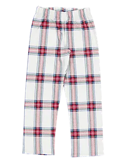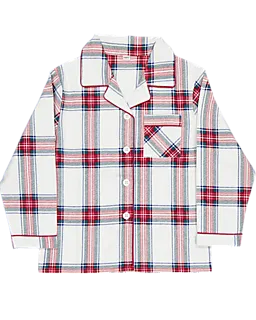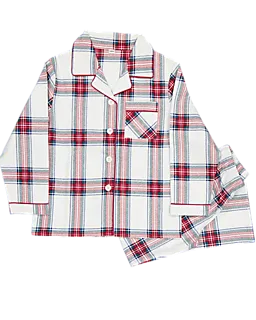Ce pyjama pour filles est fabriqué en 100 % coton avec un tissu en flanelle douce. Le modèle est blanc avec un motif à carreaux rouges, bleus et noirs, ce qui donne un aspect joyeux. Le haut a des manches longues, une fermeture à boutons, un col et une poche poitrine. Le pantalon a des jambes droites. Le tissu est confortable et convient pour passer une bonne nuit de sommeil.