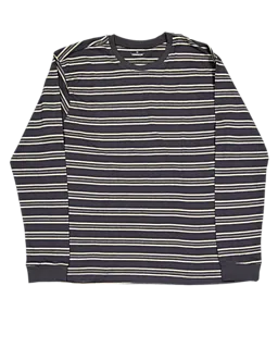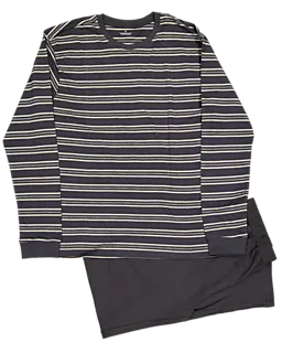 Ce pyjama pour homme se compose d’un haut rayé à manches longues et d’un pantalon uni gris foncé à taille élastiquée. Le col rond assure une coupe confortable au niveau du cou. Grâce au tissu doux 100 % coton, le pyjama offre une sensation agréable sur la peau.