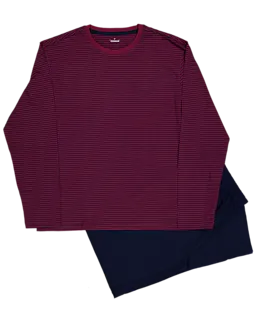 Ce pyjama pour homme comprend un tee-shirt à manches longues et à col rond, en 100 % coton. Le tee-shirt présente des rayures rouges et noires et un fin bord-côtes le long du col. Le pantalon est noir uni. Le tissu en coton rend le pyjama doux et respirant. Cette matière offre davantage de confort pendant le sommeil.