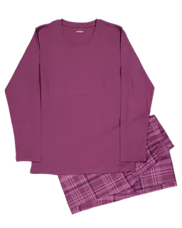 Ce pyjama en flanelle pour femme comprend un haut violet à manches longues et col rond. Celui-ci est fabriqué en coton légèrement travaillé d’élasthanne pour une coupe agréable. Le pantalon, fabriqué en 100 % coton, présente un motif à carreaux violets, une taille élastiquée et des jambes droites. La flanelle toute douce rend ce pyjama agréable sur la peau.