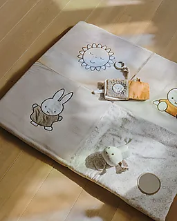 Ce tapis d’éveil beige présente quatre zones de différentes teintes avec des illustrations représentant Miffy et un soleil, ce qui invite immédiatement au jeu. Le tissu doux est agréable au toucher, permettant à votre enfant de s’allonger ou de ramper dessus confortablement. Grâce à ses dimensions de 95 x 85 cm, le tapis est suffisamment grand pour bouger et explorer.