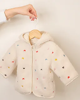 Cette veste de bébé beige à motif de cœurs a une capuche et se ferme devant avec une fermeture éclair, ce qui permet de l’enfiler et de l’enlever facilement. Grâce aux manches longues et à la coupe souple, votre bébé reste confortable et au chaud. Les couleurs douces se combinent facilement avec d’autres vêtements.