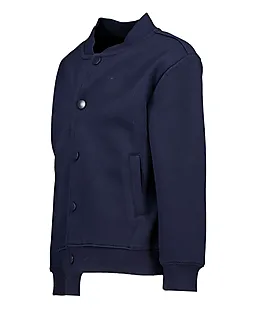 Ce gilet bleu foncé pour garçon a un col montant et se ferme avec des boutons-pression à l’avant, ce qui permet de l’ouvrir ou de le fermer facilement. Les manches longues et le bas ont des bords côtelés pour que le gilet reste bien en place. Le tissu doux et solide est confortable lorsque vous bougez, ce qui permet de le porter facilement sur un T-shirt ou un pull.