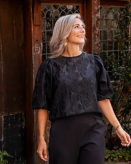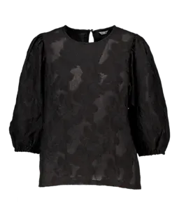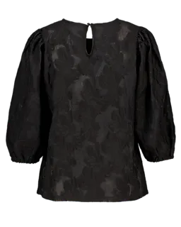 Ce chemisier noir pour femme a un col rond et est fait dans un tissu jacquard avec un motif discret. Les manches sont mi-longues, larges et munies d’un élastique pour plus de confort. Le chemisier se ferme dans le dos avec un petit bouton. Convient pour une tenue habillée ou décontractée. Facile à assortir et agréable à porter.