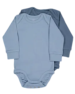 Lot de deux bodys à manches longues pour bébé, dans deux nuances de bleu. Fabriqués dans un tissu côtelé fin. L’encolure américaine permet de les enfiler et les retirer facilement, tandis que les boutons-pression à l’entrejambe simplifient le change. Parfaits à utiliser comme basiques au quotidien.