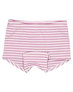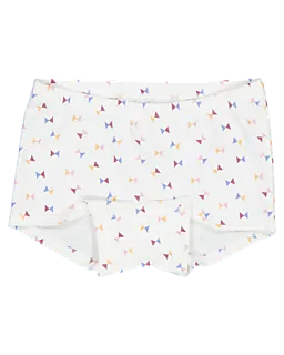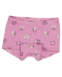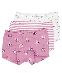 Ce lot de trois boxers pour fille présente différents imprimés aux coloris violet, blanc et rose. L’un des boxers est violet avec des petites têtes d’animaux, le deuxième est blanc avec des petits nœuds et le dernier est à rayures roses et blanches. Le tissu en coton, polyester et élasthanne est doux et extensible, pour un confort optimal. La taille élastiquée assure un ajustement confortable.