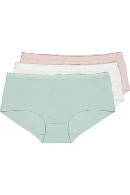 Cet ensemble se compose de trois hipsters Cara dans les couleurs vert clair, gris clair et rose clair. Grâce au mélange de coton avec un peu d’élasthanne, le tissu est légèrement extensible et s’adapte bien au corps. Les finitions lisses permettent aux bords d’être confortables sous vos vêtements.