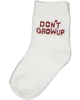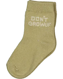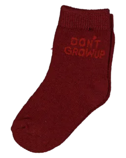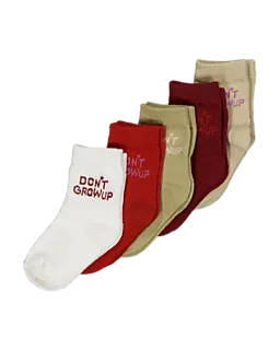 Ce lot de cinq chaussettes pour bébé est composé de blanc, rouge, vert olive et beige. Les chaussettes sont en coton avec un peu d’élasthanne, ce qui rend le tissu doux et extensible. La structure côtelée solide permet aux chaussettes de bien tenir, pour un bon maintien et un confort agréable aux pieds. Sur les chaussettes, il y a l'inscription « DON’T GROW UP ».