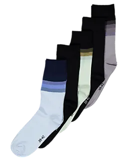 Cet ensemble de cinq paires de chaussettes pour homme comprend différentes couleurs, comme bleu clair, noir, vert et gris. Les chaussettes ont une bande contrastante en haut. Elles sont composées de coton, polyester et élasthanne, ce qui les rend douces et légèrement extensibles. Le large bord maintient bien la chaussette en place, pour qu’elle reste confortable toute la journée.