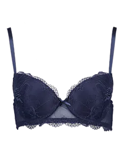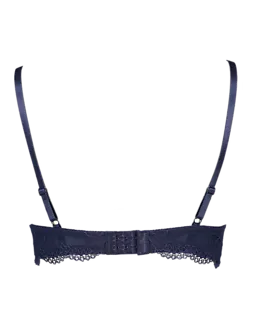 Ce soutien-gorge rembourré pour femmes est fait en dentelle bleu foncé avec un motif floral. Les bretelles sont réglables et les bonnets sont légèrement rembourrés pour plus de confort. La doublure est douce et il y a un petit nœud entre les bonnets. La bande sous la poitrine offre un bon maintien. Ce soutien-gorge convient pour un usage quotidien.
