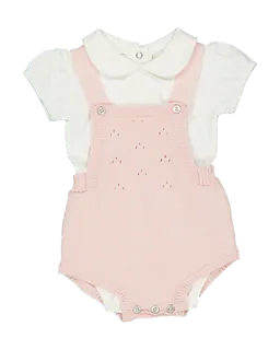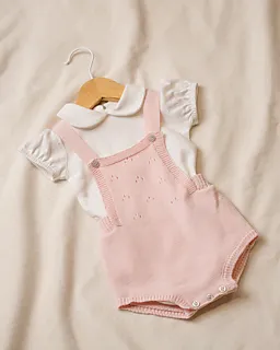 Cet ensemble rose pour bébé se compose d’un petit haut blanc avec un col et d’un pantalon rose en tricot avec bretelles et boutons sur le devant. Le tissu doux est agréable sur la peau et permet de bouger confortablement. Grâce aux boutons-pression en bas, le pantalon s’enfile et s’enlève facilement pendant l’habillage.