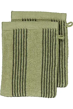 Ce lot de deux gants de toilette verts présente un motif rayé dans différentes nuances de vert. Les gants sont dotés d’une petite boucle pratique permettant de les suspendre facilement après utilisation.