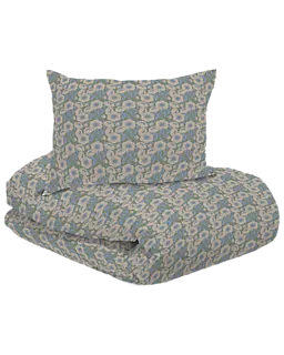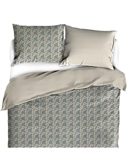 Cette parure de lit beige présente un imprimé à fines rayures sur une face et un imprimé à fleurs sur l’autre, pour pouvoir alterner. La housse de couette convient pour un lit de 200 sur 200 centimètres.