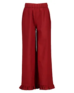 Ce pantalon rouge pour fille est en tissu tissé et a des jambes droites. Grâce à la taille élastique, il est facile à enfiler et agréable à porter. Les jambes longues sont finies avec un léger volant en bas, ce qui donne une touche simple au pantalon. Le modèle uni permet de le combiner facilement avec différents hauts.