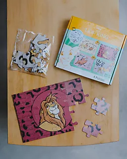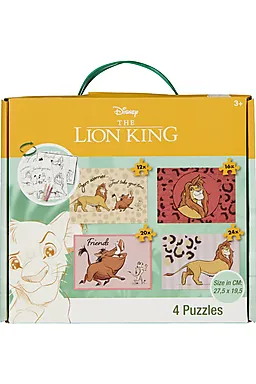 Cet ensemble de puzzles contient quatre images multicolores du Roi Lion, avec notamment Simba, Timon et Pumbaa, pour pouvoir refaire une scène différente à chaque fois. Les pièces en carton solide sont rangées dans une boîte compacte avec poignée, ce qui permet d’emporter facilement le set. Les couleurs et les dessins variés apportent de la diversité pendant que vous faites le puzzle.