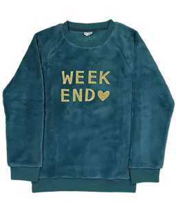 Ce twosie bleu pour fille est fabriqué en coral fleece doux, composé à 100 % de polyester. Le pull a un col rond et un message de week-end avec un cœur. Le pantalon a un motif à carreaux bleu et blanc. Grâce à sa matière chaude et confortable, cet ensemble est agréable à porter à la maison lors d’une journée de détente. Pratique pour les jours froids et facile à entretenir.