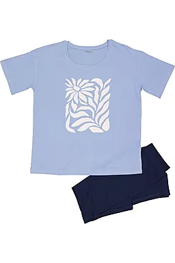 Ce pyjama pour femme a un T-shirt bleu clair à manches courtes avec un col rond. Il est léger et agréable à porter. Le motif de feuilles blanches lui donne un aspect calme. Le pantalon bleu foncé a des jambes longues pour garder vos jambes au chaud. Grâce au coton avec un peu d’élasthanne, le tissu est doux et s’étire légèrement pour plus de confort.