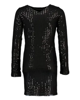Cette robe noire pour fille a un col rond et des manches longues. Le tissu tricoté est doux et légèrement extensible, ce qui la rend confortable à porter. La robe a une longueur midi, elle tombe donc sous le genou. Avec les paillettes, cette robe est idéale pour les fêtes.