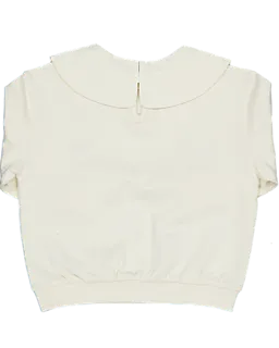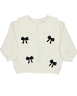 Ce sweat beige est confectionné en French terry doux et possède quatre petits nœuds noirs sur le devant. Le col est arrondi et les manches sont un peu plus larges avec un poignet étroit. Le sweat se ferme facilement avec un bouton dans le dos.