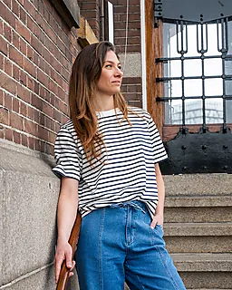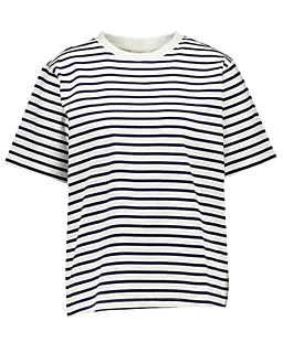 Ce T-shirt blanc pour femme a de fines rayures bleu foncé et des manches courtes. L’encolure ronde lui donne un style classique, ce qui le rend facile à combiner avec d’autres vêtements. Grâce au jersey simple tricoté et souple, il est doux sur la peau. Le motif rayé lui donne un look sobre et intemporel.