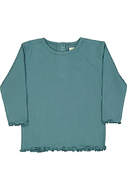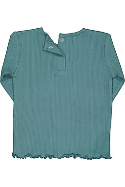 Ce tee-shirt vert pour bébé a des manches longues et un col rond. Le tissu a un aspect tricoté et est doux au toucher, pour que les bébés puissent bouger confortablement. Les extrémités des manches et le bas du tee-shirt sont ondulés, ce qui rend le vêtement agréable à porter et lui donne un look ludique. Grâce à la couleur unie, il se combine facilement avec un pantalon ou un legging.