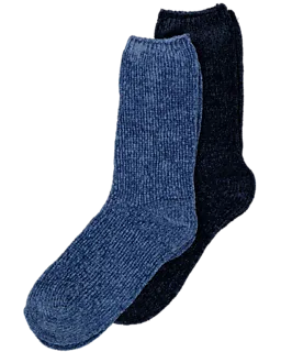 Ces chaussettes d'intérieur pour femme sont faites dans une matière douce et tricotée, avec deux tons de bleu. Grâce à la composition de 97 % polyester et 3 % élasthanne, les chaussettes sont confortables et élastiques. Elles gardent les pieds au chaud et sont agréables à porter à la maison. Le lot contient deux paires, sans motif ni décoration, adaptées à un usage quotidien.