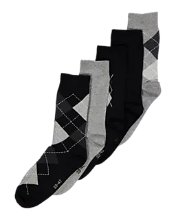 Cet ensemble de cinq paires de chaussettes pour homme est composé de coloris noir et gris avec un motif à losanges classique. Elles sont faites en coton, polyester et élasthanne, ce qui les rend agréables à porter et légèrement extensibles. Le tissu doux assure un bon confort et l’élasthanne permet aux chaussettes de bien épouser la forme du pied.