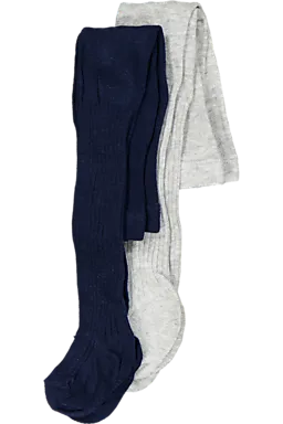 Ce lot de deux collants pour bébé, en bleu foncé et gris clair, est composé de coton, polyamide et d’un peu d’élasthanne. Les collants sont doux et légèrement extensibles, ce qui les rend agréables à porter et assure un bon ajustement. Le tissu souple permet de les enfiler facilement et ils restent bien en place quand on bouge.