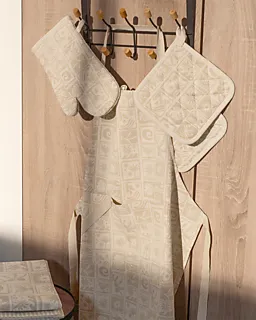 Ce gant de four beige présente un motif discret avec différentes formes et une boucle pratique pour l’accrocher facilement. Le gant est en coton avec un rembourrage doux, ce qui le rend agréable à utiliser. Avec une longueur de 29 cm, une largeur de 17 cm et une hauteur de 2 cm, il protège bien votre main de la chaleur lorsque vous sortez des casseroles ou des plats du four.
