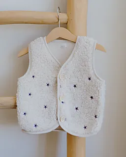 Ce gilet gris pour bébé est fabriqué dans une matière teddy douce. Le gilet se ferme avec trois boutons à l’avant. De petites broderies en forme d’étoile violette sont visibles sur le devant et le dos, ce qui apporte une touche ludique. La finition du bas est arrondie. Idéal pour garder votre bébé bien au chaud lors des journées fraîches.