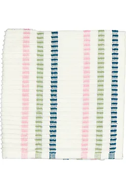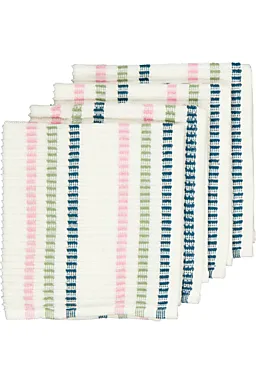 Cet ensemble de 4 lavettes a un motif rayé bleu, vert et rose sur un fond blanc. Les lavettes sont faites de 58% coton, 37% polyester et 5% autres fibres. Elles mesurent 35 sur 35 centimètres, ce qui permet de nettoyer facilement la maison. Leur matière légère sèche vite après le rinçage, pour pouvoir les réutiliser rapidement.