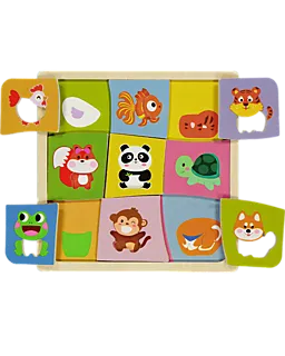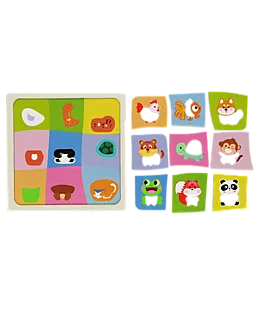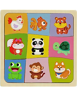 Ce puzzle en bois a neuf pièces colorées avec des animaux comme une poule, un poisson, un tigre, un renard, un panda, une tortue, une grenouille, un singe et un chien. Chaque pièce va sur une zone de couleur, ce qui aide à la placer facilement. Cela permet de s’exercer à la motricité fine et de reconnaître les couleurs et les animaux.