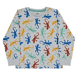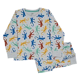 Ce pyjama pour garçon est de couleur grise et décoré de lézards colorés. L'ensemble se compose d'un pull à manches longues et d'un pantalon assorti. Le mélange de coton et de viscose offre un tissu doux et agréable sur la peau. Grâce aux manches longues, votre fils reste bien au chaud pendant les nuits plus fraîches.