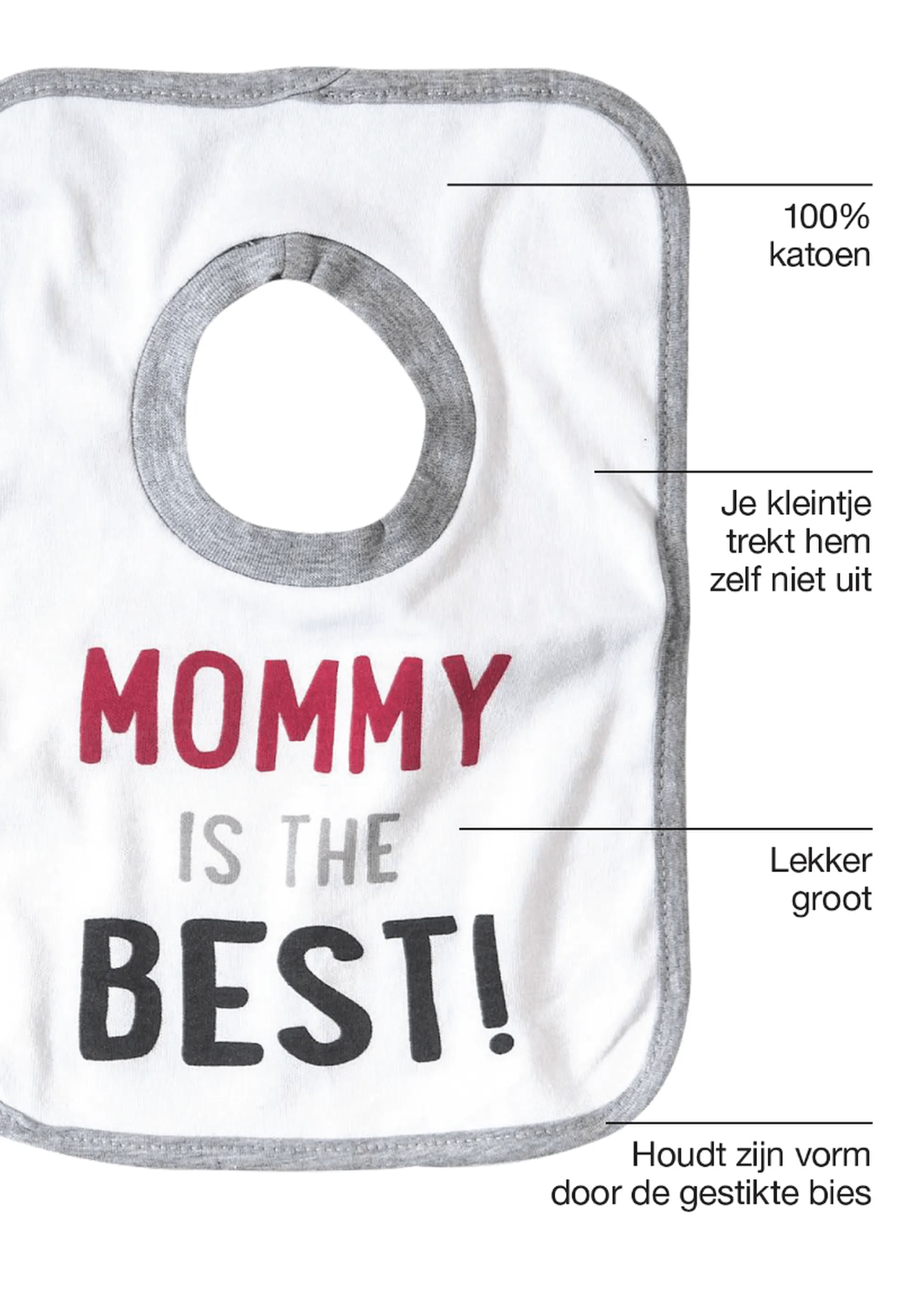 We hebben de slab zo ontworpen dat je kleintje hem niet zelf kan uittrekken. Aantrekken gaat snel en makkelijk: over het hoofd.
