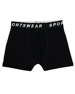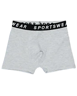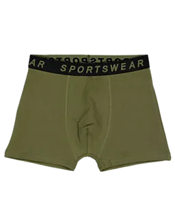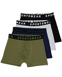Deze set van vier jongensboxers bestaat uit de kleuren groen, zwart, donkerblauw en lichtgrijs. Elke boxer heeft een zwarte tailleband met het woord 'SPORTSWEAR' in witte letters. De stof, gemaakt van 55% katoen, 40% polyester en 5% elastaan, voelt comfortabel en licht elastisch aan. De effen kleuren en zachte stof bieden optimaal draagcomfort.