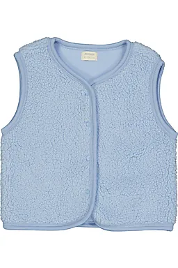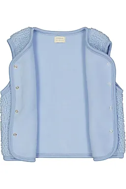Dit blauwe baby gilet is gemaakt van zachte teddy fleece. Het heeft geen mouwen en sluit met knoopjes aan de voorkant, zodat je het makkelijk aantrekt en het goed blijft zitten. De effen kleur zorgt ervoor dat je het eenvoudig combineert met andere kleding. De volle, wollige stof voelt prettig aan, waardoor je baby lekker warm blijft.