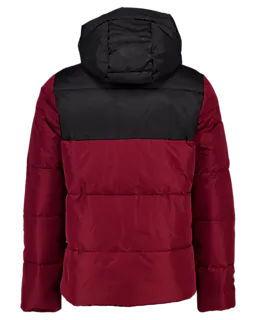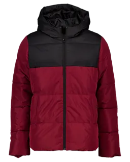 Deze herenjas heeft een sportieve uitstraling door de donkerrode en zwarte kleurvlakken. De jas is voorzien van een capuchon, lange mouwen en een lange ritssluiting aan de voorkant. Gemaakt van 100% polyester, zowel aan de buitenkant als de voering. Door de gewatteerde voering blijft de jas goed warm op koude dagen.