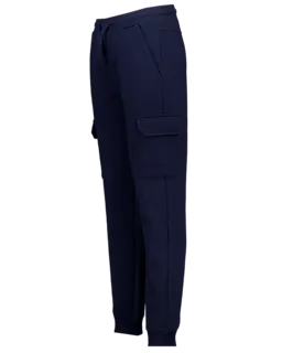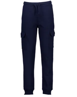 Deze joggingbroek voor jongens in de kleur donkerblauw heeft een tunnelkoord in de elastische tailleband. De broek heeft steekzakken en extra zakken met kleppen op de pijpen. Onderaan zit een boord. De rechte pasvorm zorgt voor comfort tijdens allerlei activiteiten.