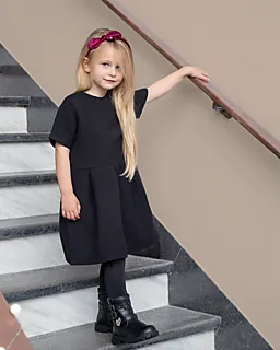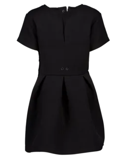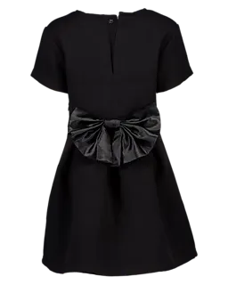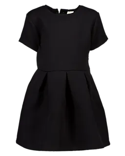 Deze zwarte meisjesjurk heeft korte mouwen en een ronde hals. De bovenkant sluit mooi aan door het knoopje achterop en de rok valt wat wijder door de plooien aan de voorkant. De jurk is makkelijk te combineren en geschikt voor verschillende gelegenheden, zoals een feestje.