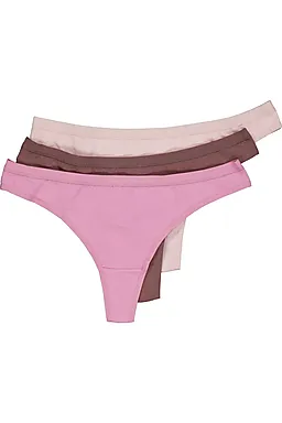 Deze set bestaat uit drie Katy strings in de kleuren paars, lichtroze en donkerbruin. De stof bestaat uit katoen met een beetje elastaan, waardoor de string zacht aanvoelt en licht mee rekt. Zo sluit het model fijn aan onder je kleding. Je draagt deze string prettig onder bijvoorbeeld een aansluitende broek of jurk.