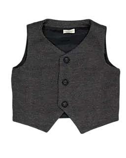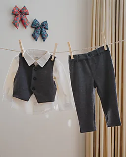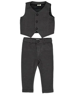Deze grijze set bestaat uit een mouwloos vest en een lange broek voor baby's. Het vest sluit met drie knopen en biedt veel bewegingsvrijheid. De broek heeft een elastische tailleband, waardoor aan- en uittrekken makkelijk is. Praktisch voor dagelijks gebruik en geschikt voor feestelijke momenten of als nette outfit voor je baby.