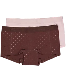 Deze Lara boxer voor dames komt in een set van 2 stuks in bruin met witte stippen en lichtroze. De brede tailleband zorgt ervoor dat de boxer goed blijft zitten, zodat je prettig kunt bewegen. Dankzij de zachte stof met katoen en een beetje elastaan voelt het ondergoed comfortabel aan op je huid.