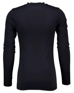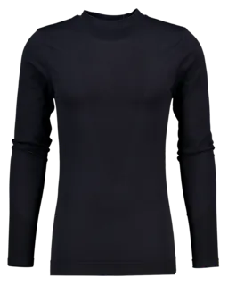 Deze zwarte thermo T-shirt voor heren heeft lange mouwen en een ronde hals. De stof is gemaakt van gerecycled polyamide, polyamide en elastaan. Het shirt sluit goed aan op het lichaam en rekt licht mee. Dit zorgt voor een comfortabele pasvorm en houdt je warm op koude dagen, bijvoorbeeld tijdens het sporten of werken buiten.
