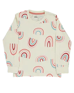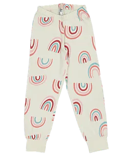 Deze pyjama voor meisjes is beige en heeft een vrolijk regenboogpatroon in rood en blauw. De set bestaat uit een shirt met lange mouwen en een lange broek. De ronde hals en de zachte, ademende stof van 100% katoen zorgen voor veel comfort tijdens het slapen. Door de rechte pasvorm kun je makkelijk bewegen in bed.