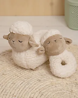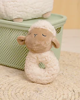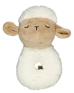 Deze rammelaar in de vorm van een schaap heeft een zachte, pluche buitenkant en is licht gevuld. Door de opening in het midden is de rammelaar makkelijk vast te houden. Gemaakt van 94% polyester en 6% plastic. Speciaal ontwikkeld voor baby's om mee te spelen en vast te pakken.